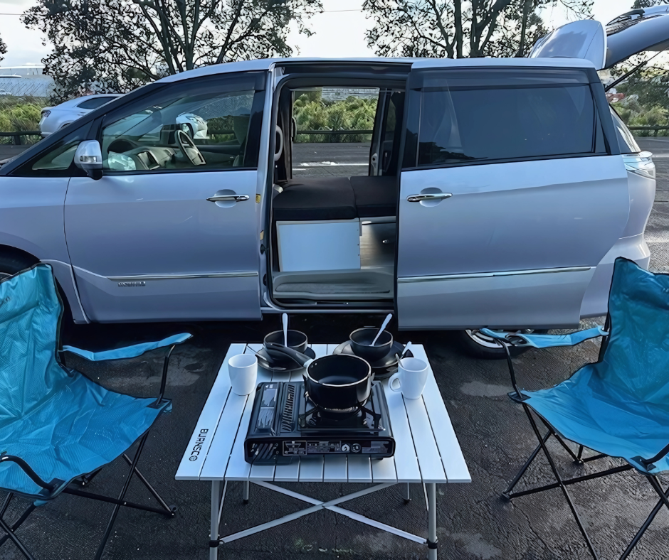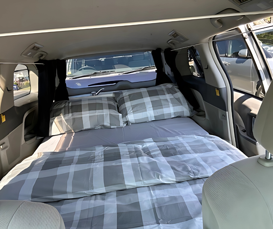 Hit the open road with this trusty Toyota Estima, a little haven on wheels made for couples or solo adventurers. Inside, you’ll find a snug bed to curl up in, a simple kitchen set-up for cooking under the stars, and plenty of space to tuck away your essentials.
